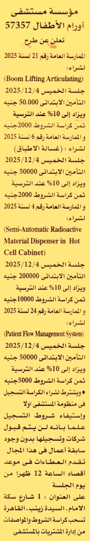 HOT Information ممارسة عامة رقم 21/2025 لعملية توريد جهاز Boom Lifting Articulating (يشترط لشراء الكراسة التسجيل في منظومة المستشفى أولا ويرفق مع المستندات سابقة أعمال) عن جريدة الأهرام Post navigation شركة القناة لتوزيع الكهرباء شركة الصرف الصحي بالإسكندرية