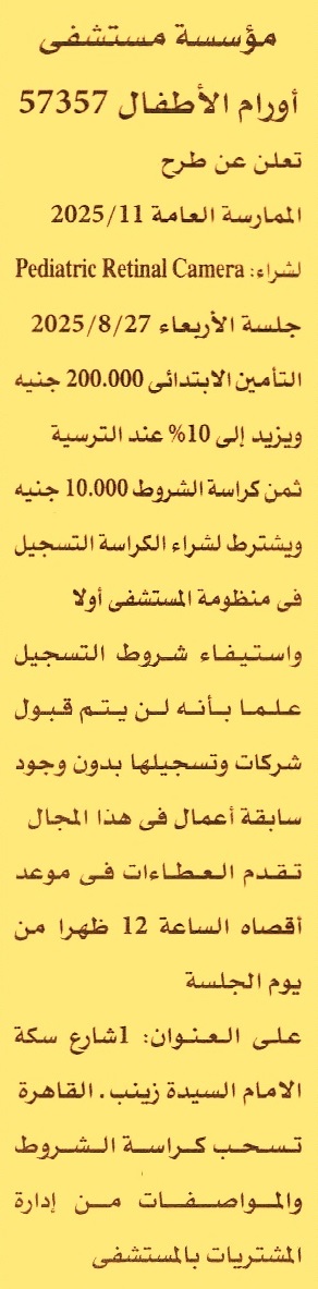 HOT Information ممارسة عامة رقم 11/2025 لعملية توريد Pediatric Retinal Camera (يشترط لشراء الكراسة التسجيل في منظومة المستشفى أولا ويرفق مع المستندات سابقة أعمال) عن جريدة الأهرام Post navigation الادارة المركزية لشئون محطات البحوث والتجارب الزراعية الهيئة المصرية العامة للتنشيط السياحي
