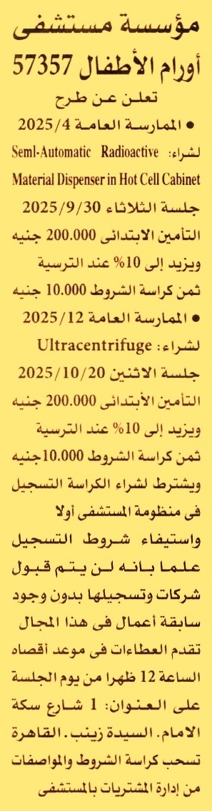 HOT Information ممارسة عامة رقم 4/2025 لعملية توريد Semi-Automatic Radioactive Material Dispenser in Hot Cell Cabinet (يشترط لشراء الكراسة التسجيل في منظومة المستشفى أولا ويرفق مع المستندات سابقة أعمال) عن جريدة الأهرام Post navigation مركز التنمية الشبابية بمدينة مغاغة الوحدة المحلية لمركز ومدينة سمالوط