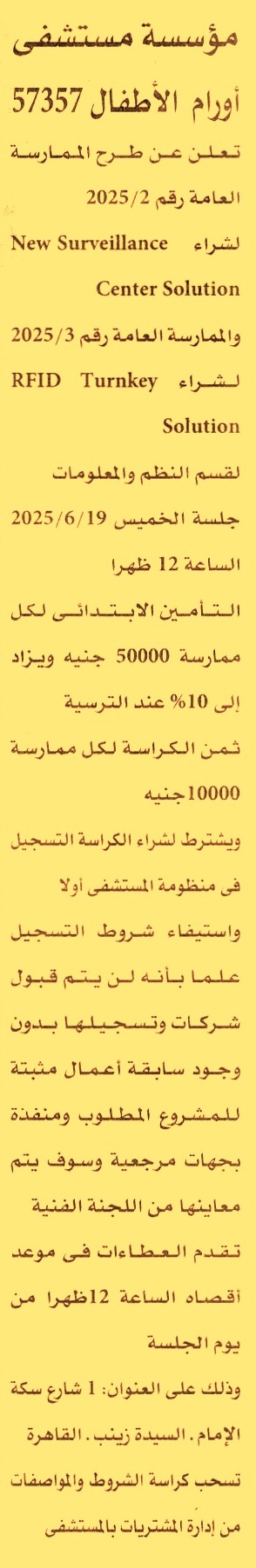 HOT Information مناقصة عامة رقم 2/2025 لعملية توريد New Surveillance Center Solution لقسم النظم والمعلومات (يرفق مع المستندات سابقة أعمال) عن جريدة الأهرام Post navigation مركز شباب مدينة منوف بالمنوفية مستشفى قصر العيني التعليمي الجديد