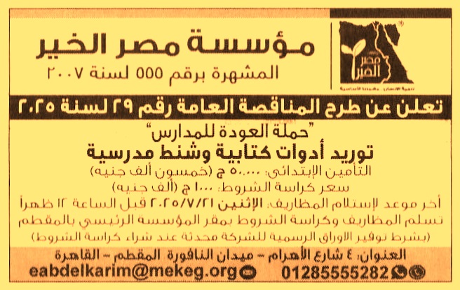 HOT Information مناقصة عامة رقم 29/2025 لعملية توريد أدوات كتبية وشنط مدرسية “حملة العودة للمدارس” عن جريدة الأهرام Post navigation المصفي القضائي/ زكريا نصيف لبيب شركة الخدمات الطبية