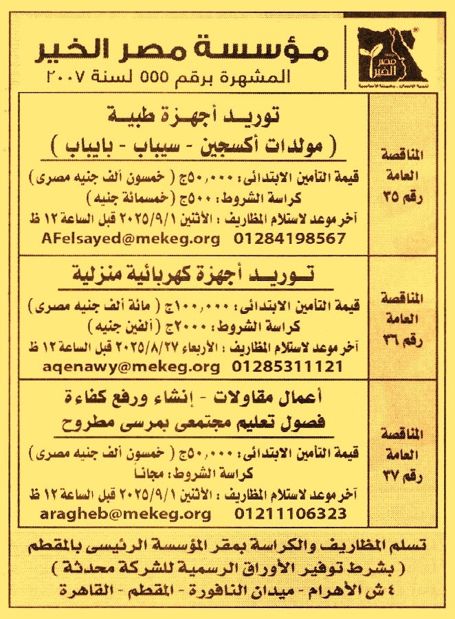 HOT information مناقصة عامة رقم 35/2025 لعملية توريد أجهزة طبية “مولدات أكسجين – سيباب – بايباب” عن جريدة الأهرام Post navigation البنك الزراعي المصري البنك الأهلي المصري