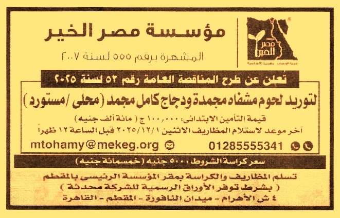 HOT Information مناقصة عامة رقم 53/2025 لعملية توريد لحوم مشفاه مجمدة ودجاج كامل مجمد “محلي/مستورد” عن جريدة الأهرام Post navigation البنك الزراعي المصري البنك الأهلي المصري