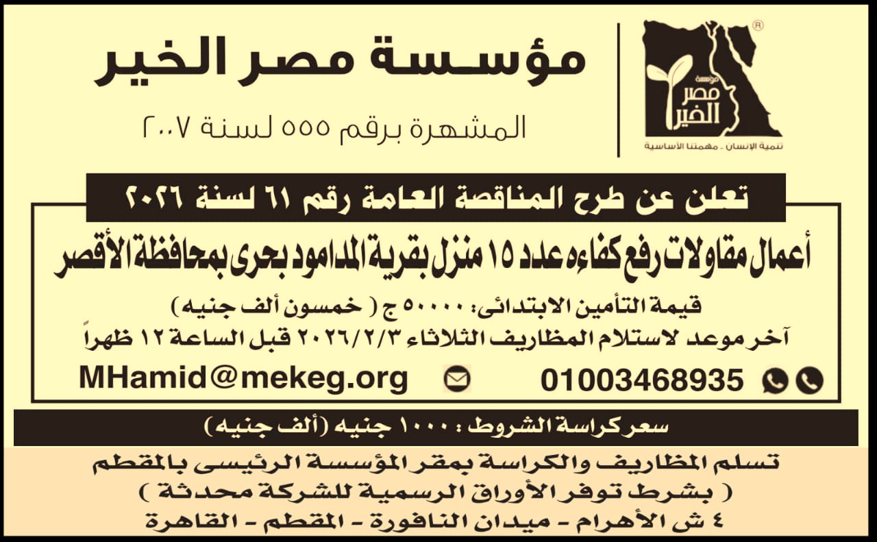 HOT information مناقصة عامة رقم 61 لعملية أعمال مقاولات رقع كفاءة عدد 15 منزل بقرية المدامود بحري بمحافظة الأقصر HOT Post navigation وزارة السياحة والأثار قطاع الترميم ومشروعات الأثار والمتاحف مؤسسة مصر الخير