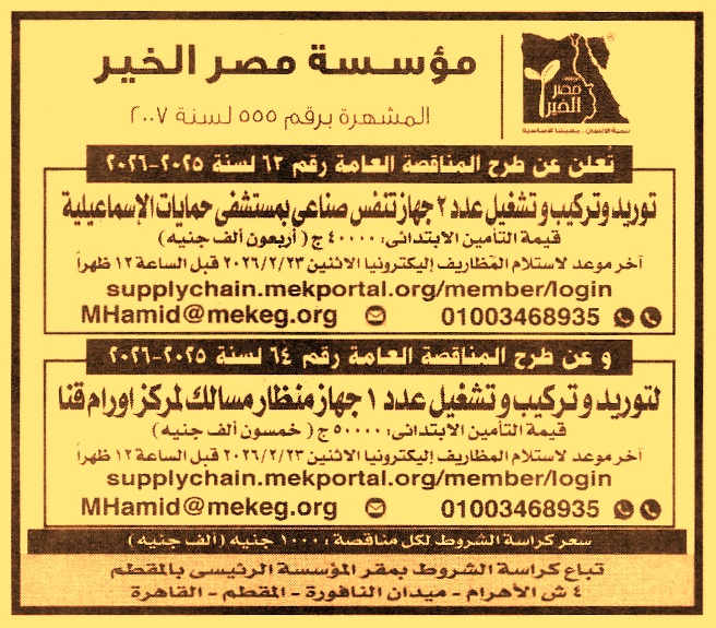 توريد وتركيب وتشغيل عدد 2 جهاز تنفس صناعي بمستشفى حميات الإسماعيلية