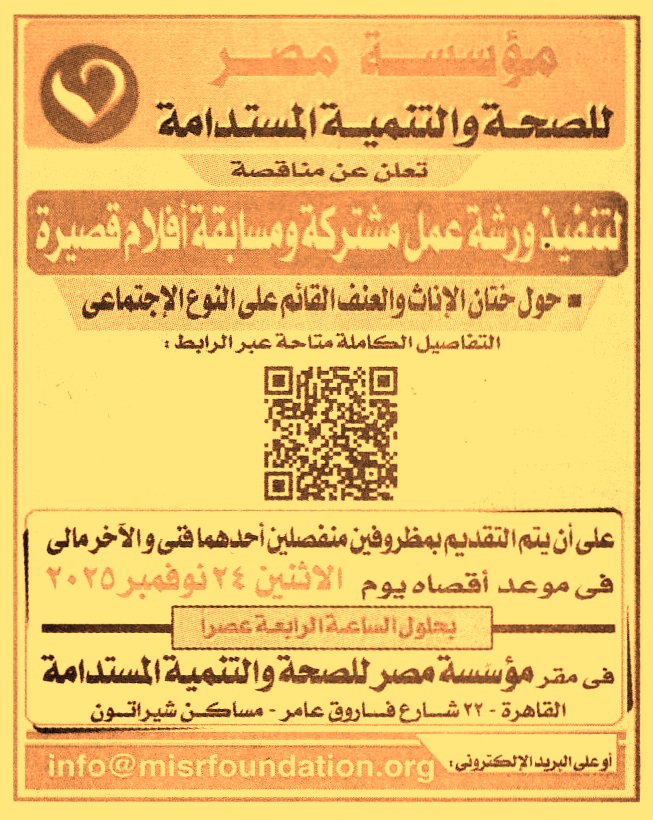 HOT Information مناقصة عامة لعملية تنفيذ ورشة عمل مشتركة ومسابقة أفلام قصيرة حول ختان الإناث والعنف القائم على النوع الاجتماعي (أخر موعد لتقديم العطاءات يوم 24/11/2025 الساعة 4 ع) عن جريدة الجمهورية Post navigation شركة مياه الشرب والصرف الصحي بالغربية الجهاز المركزي للمحاسبات