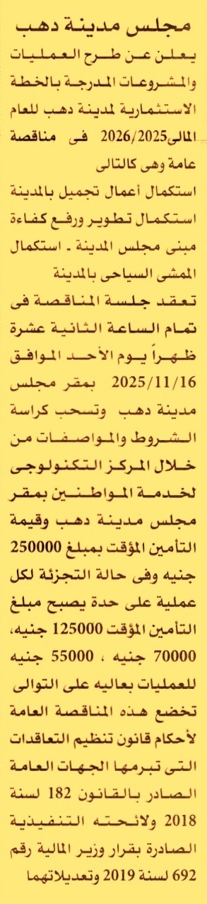 HOT information مناقصة عامة لعملية تنفيذ الأعمال الأتية (1) استكمال أعمال تجميل بالمدينة (2) استكمال تطوير ورفع كفاءة مبنى مجلس المدينة (3) استكمال الممشى السياحي بالمدينة عن جريدة الأهرام Post navigation الجمعية المصرية لتقدم الأشخاص ذوي الإعاقة والتوحد الشركة القابضة الحيوية واللقاحات