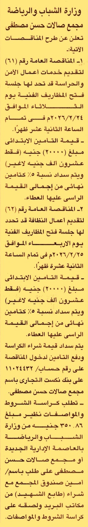 HOT information مناقصة عامة رقم 61 لعملية تقديم خدمات أعمال الأمن والحراسة عن جريدة الجمهورية Post navigation مركز التنمية الشبابية ببركة السبع – المنوفية هيئة النقل العام بالقاهرة
