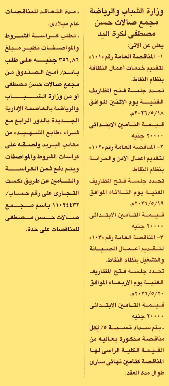 HOT information مناقصة عامة رقم 101 لعملية تقديم خدمات أعمال النظافة لمدة عام (بنظام النقاط) عن جريدة الجمهورية Post navigation نادي الشمس الرياضي مستشفيات جامعة القاهرة