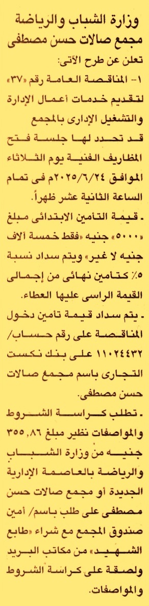 HOT Information مناقصة عامة رقم 37 لعملية تقديم خدمات أعمال الإدارة والتشغيل الإداري بالمجمع عن جريدة الجمهورية Post navigation الوحدة المحلية لمركز ومدينة ابو تشت مركز شباب عرب أبو ختيرش