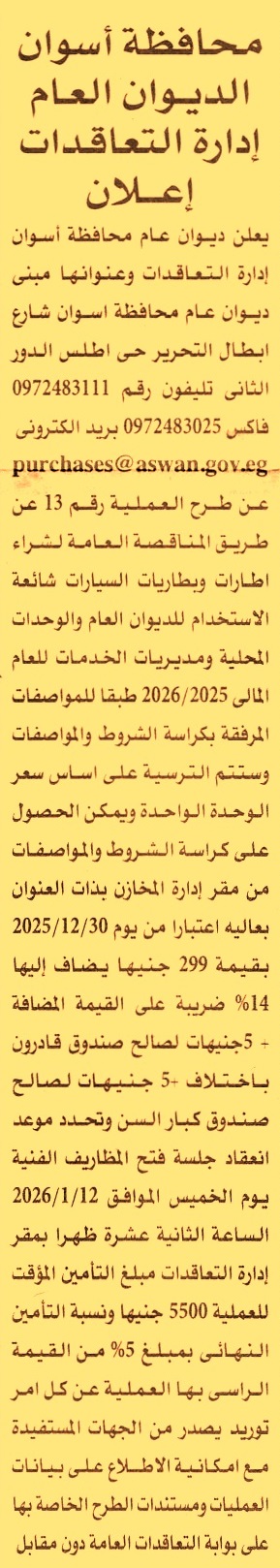 HOT Information مناقصة عامة رقم 113 لعملية توريد إطارات وبطاريات السيارات شائعة الاستخدام للديوان العام والوحدات المحلية ومديريات الخدمات عن جريدة الأهرام Post navigation مركز التدريب الإقليمي للموارد المائية والري الشركة المصرية لإدارة وتشغيل المترو