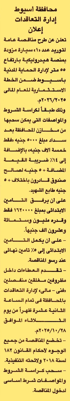 HOT Information مناقصة عامة لعملية توريد عدد 1 سيارة مزودة بمنصة هيدروليكية بارتفاع 55م لإدارة الحماية المدنية بأسيوط عن جريدة الجمهورية Post navigation شركة النوبارية لصناعة وتكرير السكر مركز التنمية الشبابية بالداخلة