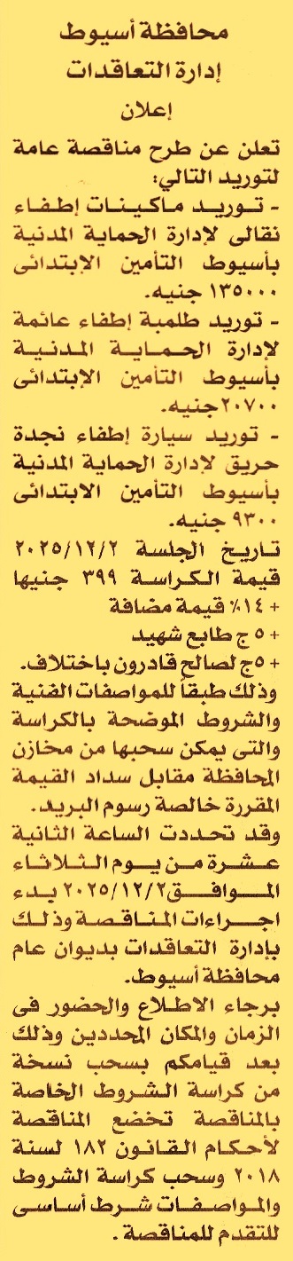 HOT Information مناقصة عامة لعملية توريد الأتي (1) ماكينات إطفاء نقالي لإدارة الحماية المدنية (2) طلمبة إطفاء عائمة لإدارة الحماية المدنية (3) سيارة إطفاء نجدة حريق لإدارة الحماية المدنية عن جريدة الأخبار Post navigation بنك مصر الهيئة العامة للتأمين الصحي فرع وسط الصعيد