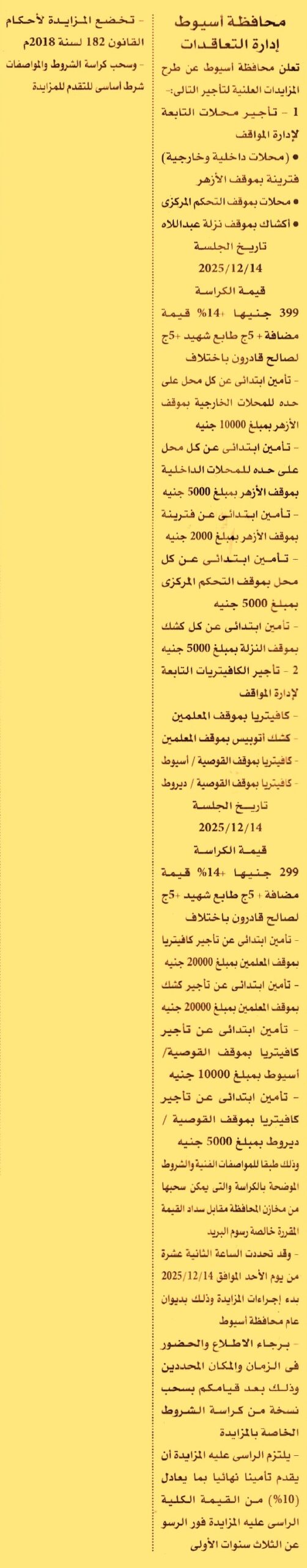 HOT Information مزايدة علنية لعملية تأجير المحلات التابعة لإدارة المواقف (1) محلات داخلية وخارجية “فترينة” بموقف الأزهر (2) محلات بموقف التحكم المركزي (3) أكشاك بموقف نزله عبد اللاه عن جريدة الأهرام Post navigation مركز البحوث الزراعية شركة مصر العامرية للغزل والنسيج