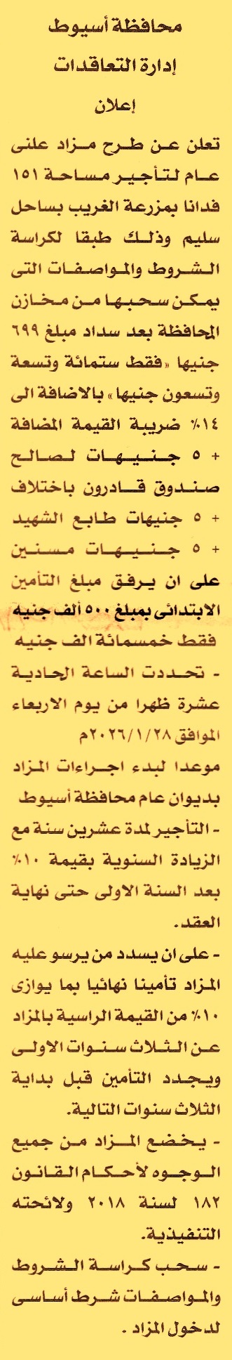 HOT Information مزايدة علنية عامة لعملية تأجير مساحة 151 فدان بمزرعة الغريب بساحل سليم لمدة 20 سنوات بزيادة 10% سنويا عن جريدة الأخبار Post navigation مركز شباب أبو السعود جهاز القرى السياحية