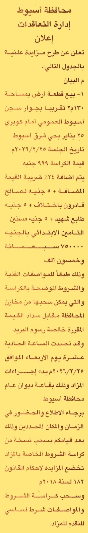 HOT Information مزايدة علنية عامة لعملية بيع قطعة أرض بمساحة 130م2 تقريبا بجوار سجن أسيوط العمومي أمام كوبري 25 يناير بحي شرق أسيوط عن جريدة الجمهورية Post navigation مركز شباب محلة اللبن جامعة طيبة التكنولوجية