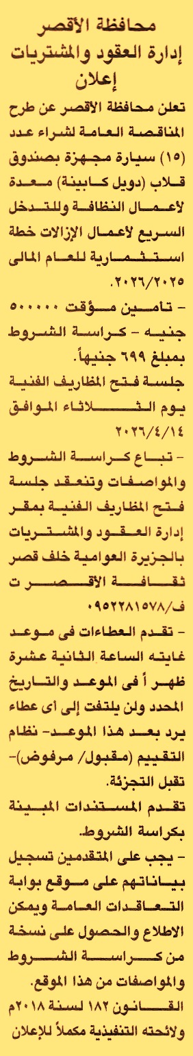 HOT Information مناقصة عامة لعملية توريد عدد 15 سيارة مجهزة بصندوق قلاب “دوبل كابينة” معدة لأعمال النظافة والتدخل السريع لأعمال الإزالات عن جريدة الجمهورية Post navigation مركز شباب الرياض الهيئة العامة للرقابة على الصادرات والواردات