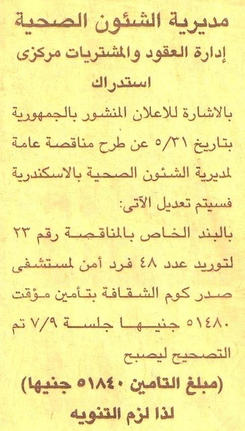 بالإشارة للإعلان المنشور بجريدة الجمهورية بتاريخ 31/5