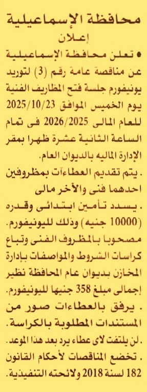 HOT information مناقصة عامة رقم 3/2025/2026 لعملية توريد يونيفورم عن جريدة الأهرام Post navigation مديرية الطرق والنقل بالقاهرة الإدارة العامة لري النوبارية