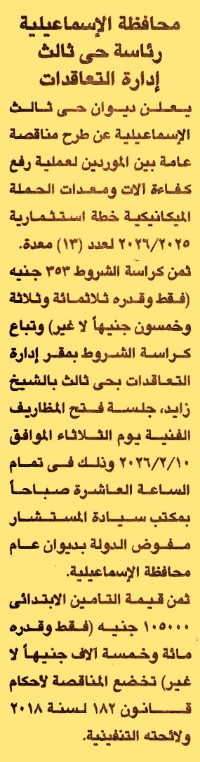 HOT Information مناقصة عامة لعملية رفع كفاءة ألات ومعدات الحملة الميكانيكية لعدد 13 معدة عن جريدة الجمهورية Post navigation هيئة الإسعاف المصرية وزارة المالية