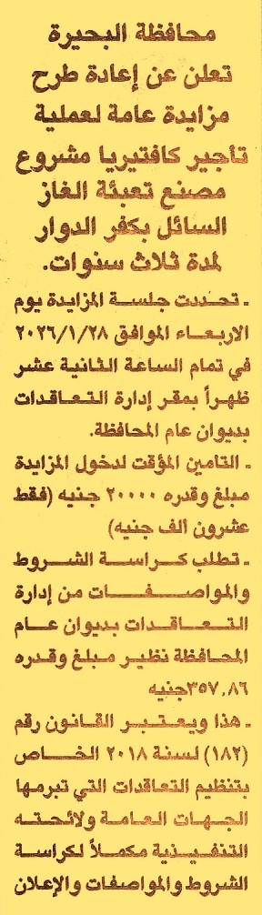 HOT Information إعادة مزايدة عامة لعملية تأجير كافتيريا مشروع مصنع تعبئة الغاز السائر بكفر الدوار لمدة 3 سنوات عن جريدة الجمهورية Post navigation مركز تنمية شبابية الصف هيئة النقل العام بالقاهرة