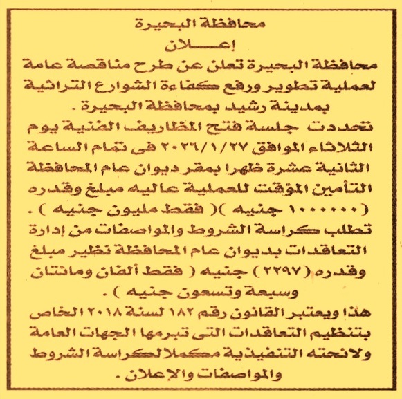 HOT Information مناقصة عامة لعملية تطوير ورفع كفاءة الشوارع التراثية بمدينة رشيد بمحافظة البحيرة عن جريدة الجمهورية Post navigation نادي الزراعيين بالسنبلاوين مركز شباب العباسية بدمياط