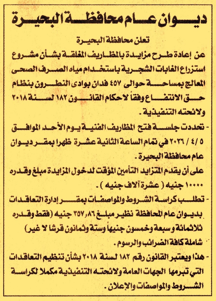 HOT Information إعادة مزايدة عامة لعملية تنفيذ مشروع استزراع الغابات الشجرية باستخدام مياه الصرف الصحي المعالج بمساحة حوالي 457 فدان بوادي النطرون بنظام حق الانتفاع عن جريدة الجمهورية Post navigation الجهاز المركزي للتعبئة العامة والإحصاء الهيئة العامة للاستثمار والمناطق الحرة