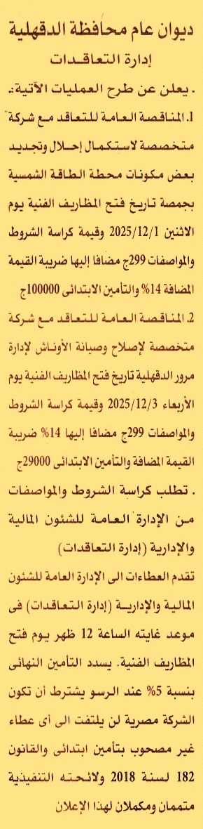 HOT Information مناقصة عامة لعملية استكمال إحلال وتجديد بعض مكونات محطة الطاقة الشمسية بجمصة عن جريدة الأهرام Post navigation وزارة التربية والتعليم والتعليم الفني مكتب النائب العام
