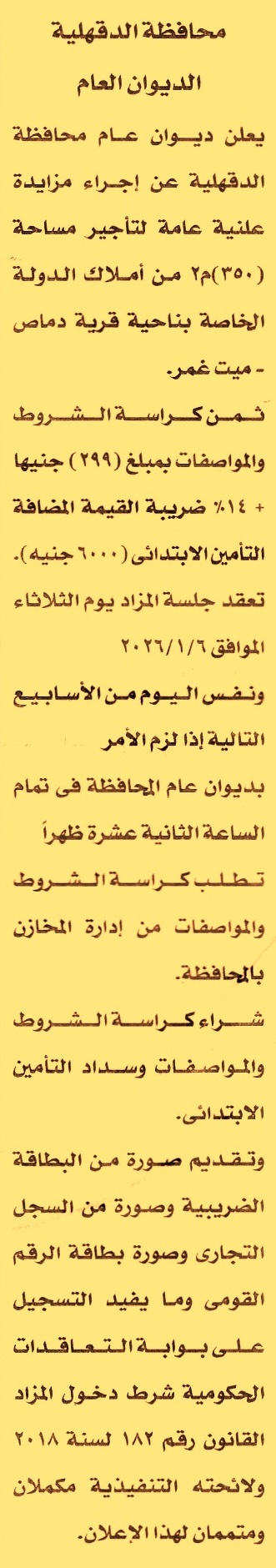 HOT Information مزايدة علنية عامة لعملية تأجير مساحة 350م2 من أملاك الدولة الخاصة بناحية قرية دماص – ميت غمر (تعاد الجلسة أسبوعيا حتى إتمام الرسو ويرفق مع المستندات صورة بطاقة الرقم القومي) عن جريدة الأخبار Post navigation شركة مضارب كفر الشيخ مركز شباب مدينة قلين