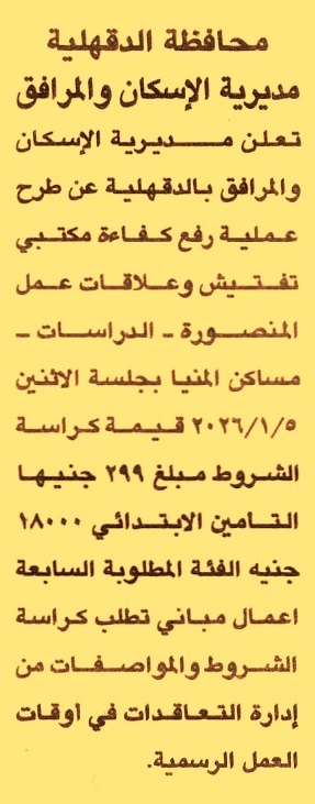 HOT Information مناقصة عامة لعملية رفع كفاءة مكتبي تفتيش وعلاقات عمل المنصورة – الدراسات – مساكن المنيا (فئة التصنيف السابعة شعبة أعمال مباني) عن جريدة الجمهورية Post navigation محافظة الدقهلية جمعية دار السعادة للإسكان التعاوني