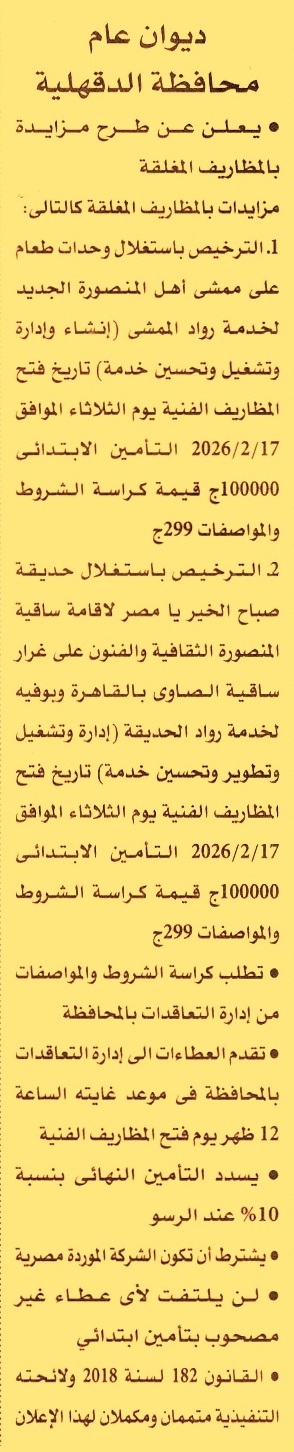 HOT Information مزايدة عامة لعملية الترخيص باستغلال وحدات طعام على ممشى أهل المنصورة الجديد لخدمة رواد الممشى “إنشاء وإدارة وتشغيل وتحسين خدمة” عن جريدة الأهرام Post navigation محافظة أسيوط شركة قنا لصناعة الورق