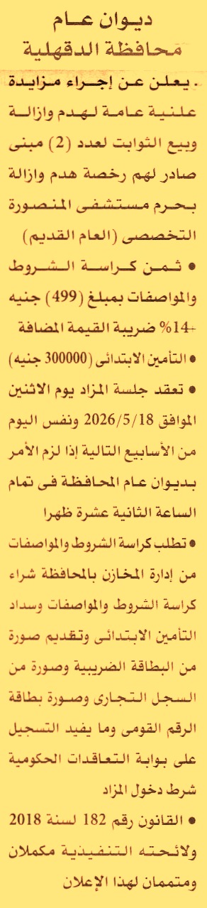 HOT Information مزايدة علنية عامة لعملية هدم وإزالة وبيع الثوابت لعدد 2 مبنى صادر لهم رخصة هدم وإزالة بحرم مستشفى المنصورة التخصصي “العام القديم” (تعاد الجلسة أسبوعيا حتى إتمام الرسو ويرفق مع المستندات صورة بطاقة الرقم القومي) عن جريدة الأهرام Post navigation المعمل المركزي لتحليل متبقيات المبيدات مكتبة الإسكندرية