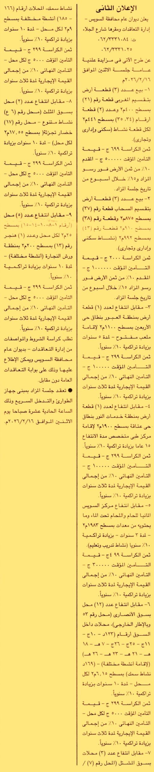 HOT Information مزايدة علنية عامة لعملية بيع عدد 3 قطعة أرض بتقسيم المغربي قطعة رقم 21 بمساحة 400م2 وعدد 2 قطعة أرقام 34, 35 بمساحة 441م2 لكل قطعتة نشاط “سكني وإداري وتجاري” عن جريدة الجمهورية Post navigation نادي الشركة المالية والصناعية الرياضي بكفر الزيات نادي اتحاد الأشراف الرياضي بالإسماعيلية