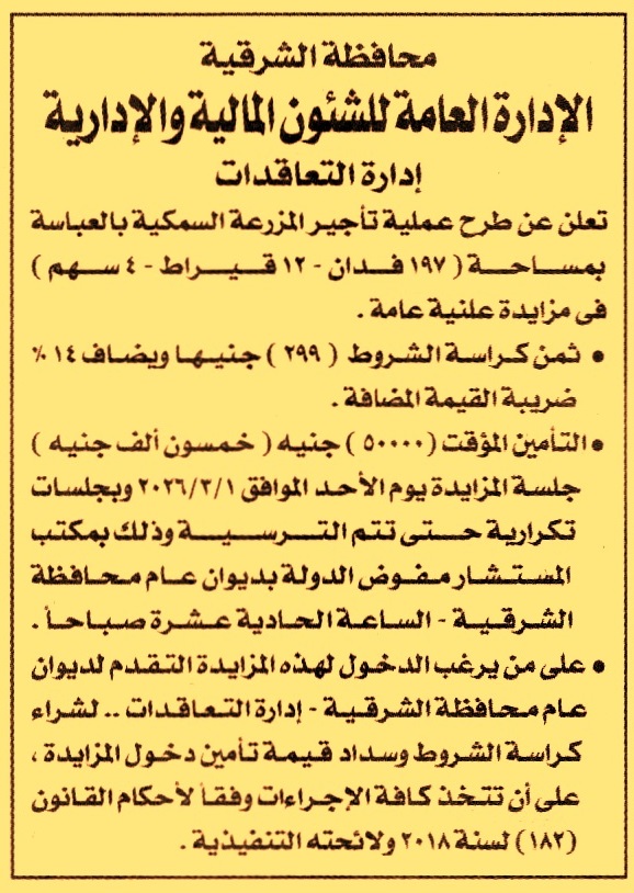 HOT Information مزايدة علنية عامة لعملية تأجير المزرعة السمكية بالعباسة بمساحة 197ف 12ط 4س (تعاد الجلسة أسبوعيا حتى إتمام الرسو) عن جريدة الجمهورية Post navigation جمعية بدر التعاونية للتعمير والإسكان جامعة الزقازيق