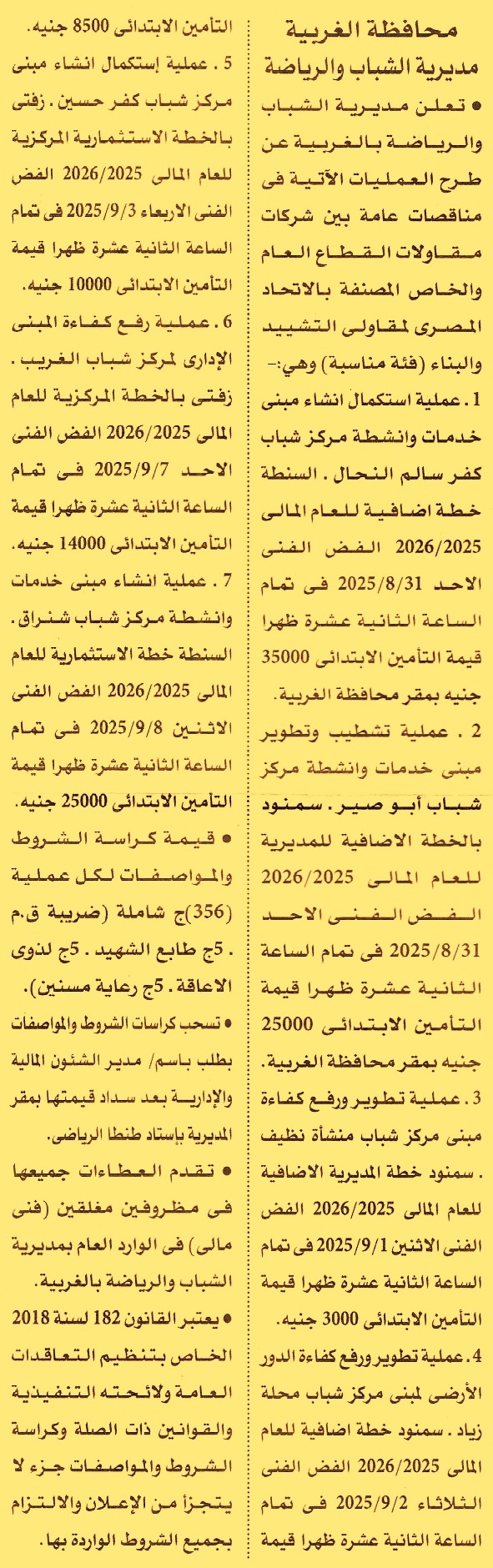 استكمال إنشاء مبنى خدمات وأنشطة مركز شباب كفر سالم النحال – السنطة