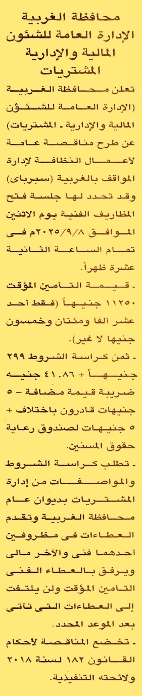 HOT Information مناقصة عامة لعملية تنفيذ أعمال النظافة لإدارة المواقف بالغربية “سبرباي” عن جريدة الجمهورية Post navigation الإدارة العامة لري غرب قنا مستشفى أورام الإسماعيلية التعليمي