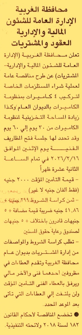 HOT Information مناقصة عامة لعملية توريد المستلزمات الخاصة لتركيب 4 كاميرات بمنظوة الكاميرات بالديوان العام وكذا زيادة المساحة التخزينية لمنظومة الكاميرات من 30 يوم إلى 60 يوم عن جريدة الجمهورية Post navigation الجهاز المركزي للمحاسبات جامعة طنطا