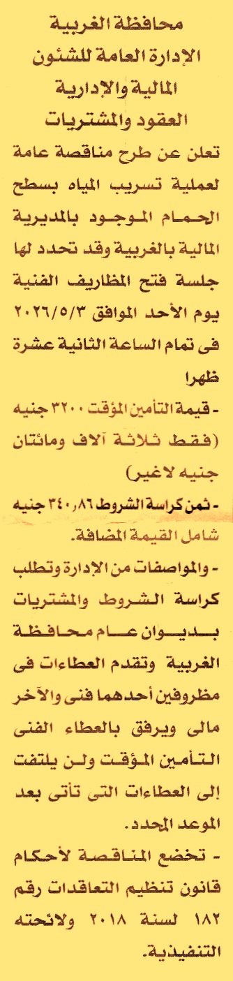 HOT Information مناقصة عامة لعملية تنفيذ أعمال تسريب المياه بسطح الحمام الموجود بالمديرية المالية بالغربية عن جريدة الأخبار Post navigation البنك الاهلي المصري مركز شباب المعادي