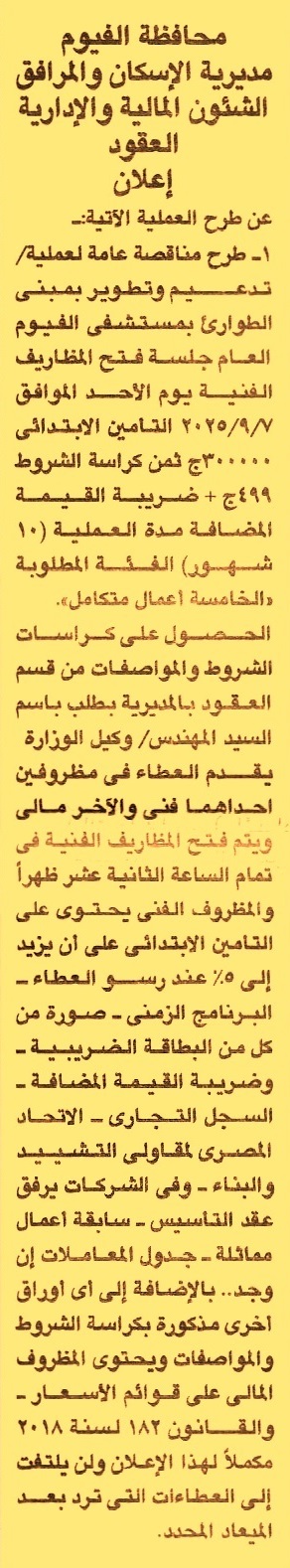 HOT Information مناقصة عامة لعملية تدعيم وتطوير بمبنى الطوارئ بمستشفى الفيوم العام مدة العملية 10 أشهر (فئة التصنيف الخامسة شعبة أعمال مباني متكاملة ويرفق مع المستندات البرنامج الزمني وعقد تأسيس الشركة وسابقة أعمال) عن جريدة الجمهورية Post navigation محافظة قنا مركز شباب الكفاح أبو الهول