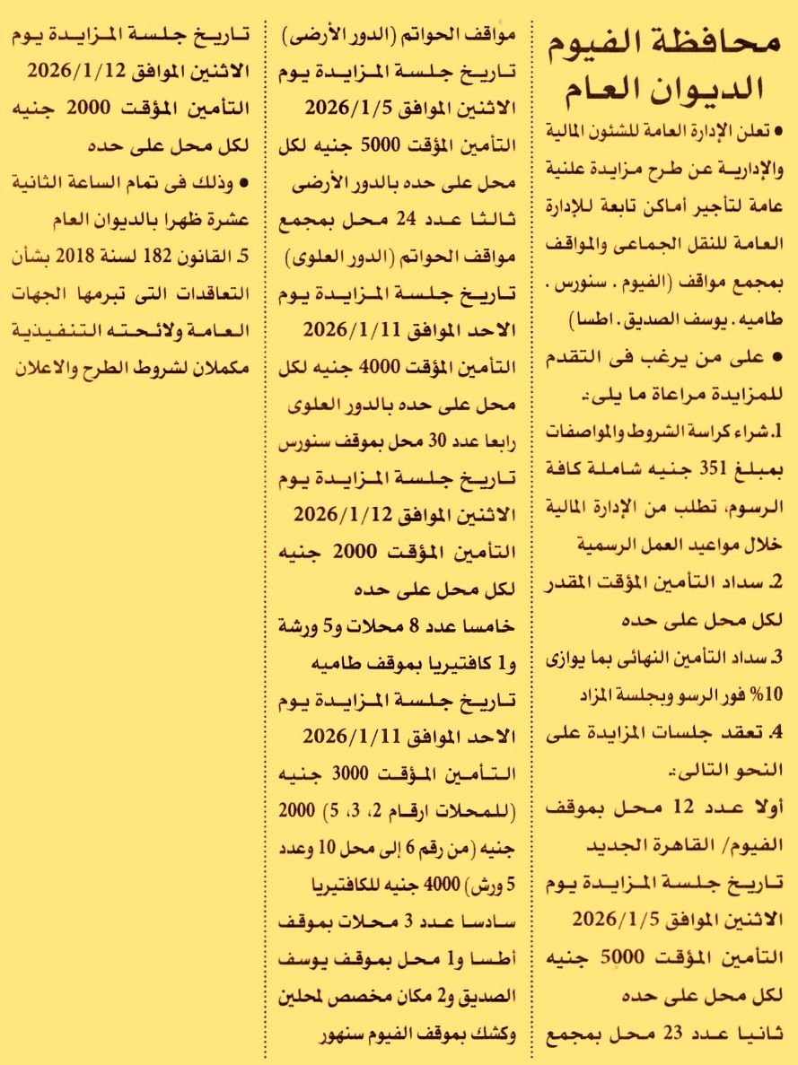 HOT Information مزايدة علنية عامة لعملية تأجير عدد 12 محل بموقف الفيوم/ القاهرة الجديد تابعة للإدارة العامة للنقل الجماعي والمواقف بمجمع مواقف “الفيوم, سنورس, طاميه, يوسف الصديق, اطسا” عن جريدة الأهرام Post navigation الشركة المصرية للمطارات شركة واحات السيليكون للمناطق التكنولوجية