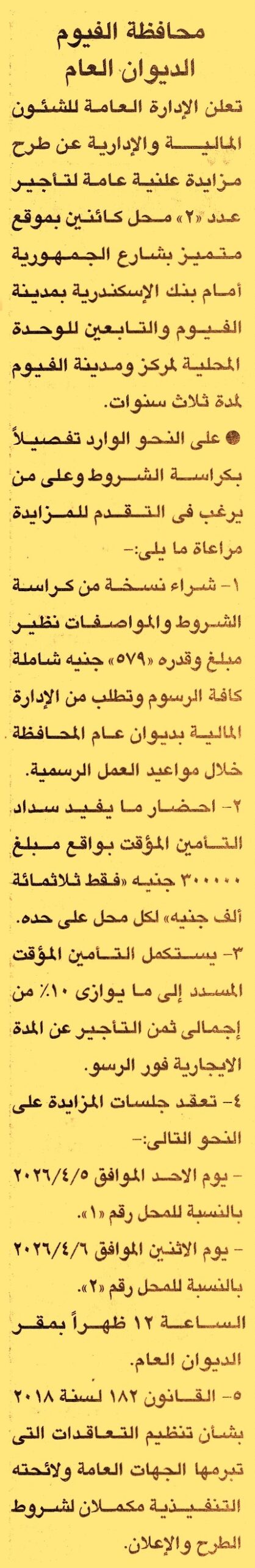 HOT information مزايدة علنية عامة لعملية تأجير عدد 1 محل كائن بموقع متميز بشارع الجمهورية أمام بنك الإسكندرية بمدينة الفيوم والتابعين للوحدة المحلية لمركز ومدينة الفيوم لمدة 3 سنوات عن جريدة الجمهورية Post navigation البنك العقاري المصري العربي