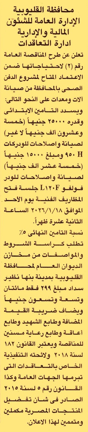 HOT Information مناقصة عامة رقم 2/2025/2026 لعملية صيانة ألات ومعدات لمشروع الدفن الصحي بالمحافظة (1) لودر كات 950H (2) لودر فولفو L120F عن جريدة الجمهورية Post navigation جهاز تنمية مدينة 6 أكتوبر الجديدة مستشفى الهلال
