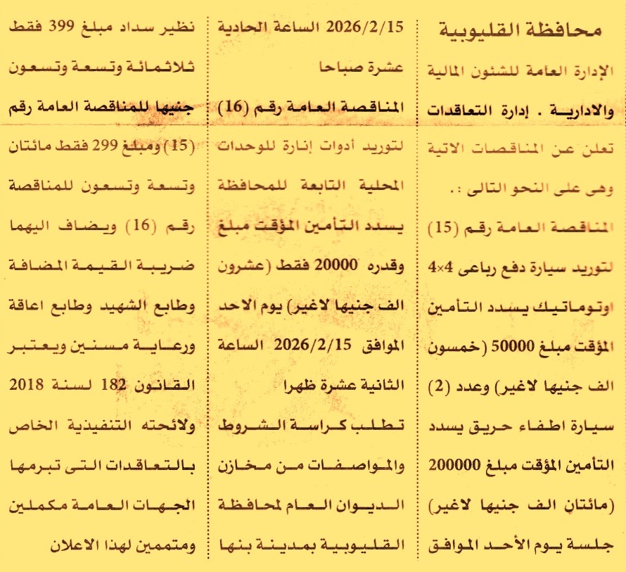 HOT information مناقصة عامة رقم 15/2025/2026 لعملية توريد الأتي (1) سيارة دفع رباعي 4×4 أوتوماتيك (2) عدد 2 سيارة اطفاء حريق عن جريدة الأهرام Post navigation محافظة المنوفية شركة الغازات البترولية