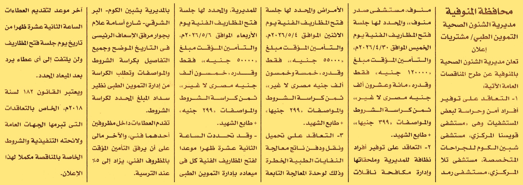 HOT information مناقصة عامة لعملية توفير أفراد أمن وحراسة لبعض المستشفيات وهي “مستشفى قويسنا المركزي, مستشفى شبين الكوم للجراحات المتخصصة, مستشفى تلا المركزي, مستشفى رمد منوف, مستشفى صدر منوف” عن جريدة الأخبار Post navigation بنك مصر شركة قنا لصناعة الورق