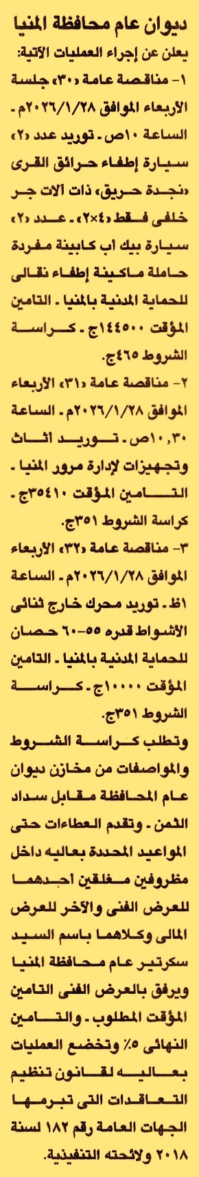 HOT Information مناقصة عامة رقم 30 لعملية توريد عدد 2 سيارة إطفاء حرائق القرى “نجدة حريق” ذات ألات جر خلفي فقط 4×2 وعدد 2 سيارة بيك أب كابينة مفردة حاملة ماكينة إطفاء نقالي للحماية المدنية بالمنيا عن جريدة الجمهورية Post navigation معهد بحوث الإنتاج الحيواني مركز شباب مدينة قنا
