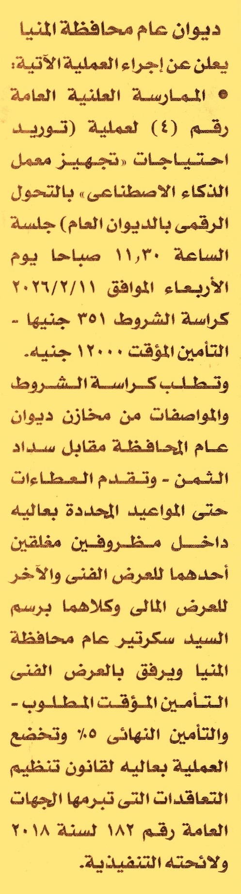 HOT information ممارسة عامة رقم 4 لعملية توريد احتياجات تجهيز معمل الذكاء الاصطناعي بالتحول الرقمي بالديوان العام عن جريدة الأخبار Post navigation الهيئة المصرية العامة للكتاب شركة مصانع النحاس المصرية