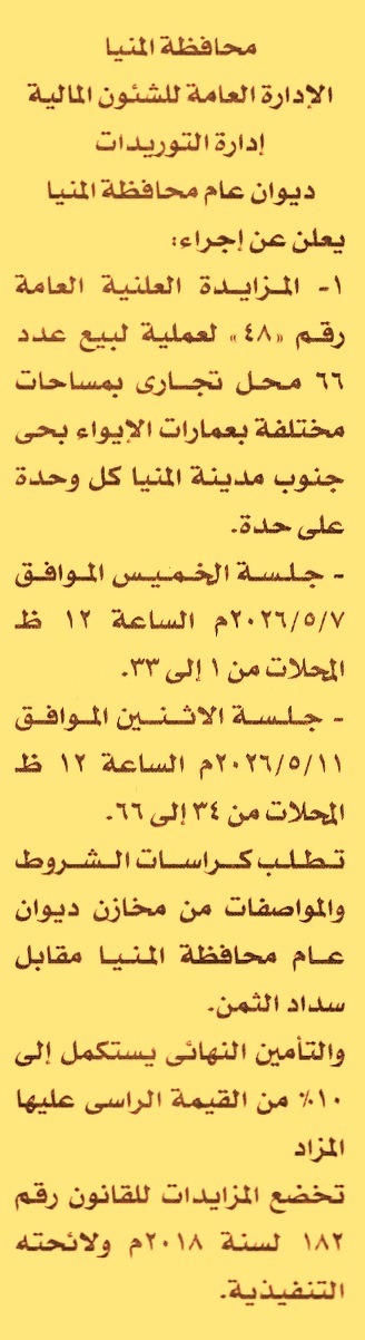 HOT Information مزايدة علنية عامة رقم 48 لعملية بيع عدد 33 محل تجاري بمساحات مختلفة بعمارات الإيواء بحي جنوب مدينة المنيا عن جريدة الأخبار Post navigation مركز شباب المعادي الجمعية التعاونية لبناء المساكن لأعضاء هيئة التدريس وموظفي الأزهر