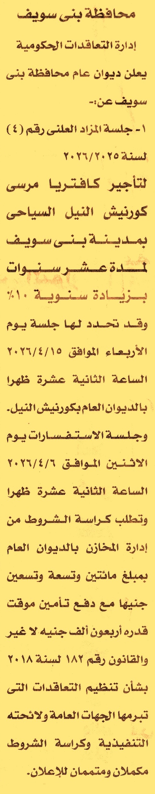 HOT Information مزايدة علنية رقم 4/2025/2026 لعملية تأجير كافتيريا مرسى كورنيش النيل السياحي بمدينة بني سويف لمدة 10 سنويات بزيادة 10% سنويا (جلسة الاستفسارات يوم 6/4/2026) عن جريدة الأخبار Post navigation مؤسسة أخبار اليوم محافظة بني سويف