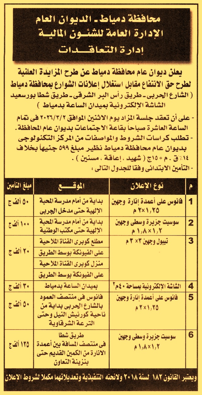 حق الانتفاع مقابل استغلال إعلانات الشوارع بمحافظة دمياط