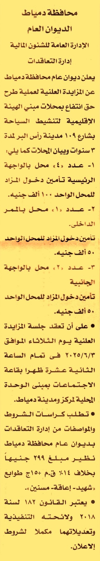 HOT Information مزايدة علنية لعملية حق انتفاع بمحلات مبنى الهيئة الإقليمية لتنشيط السياحة بشارع 109 مدينة رأس البر لمدة 3 سنوات (1) عدد 4 محل بالواجهة الرئيسية (2) عدد 1 محل بالممر الداخلي (3) عدد 2 محل بالواجهة الجانبية عن جريدة الأخبار Post navigation شركة أبو زعبل للكيماويات المتخصصة مركز شباب كفر كردي بكفر شكر